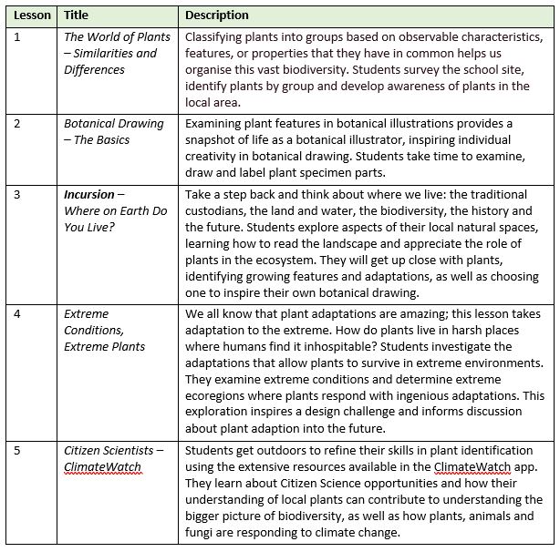 Lessons plans on the subjects of Botany Basic, the World of Photosynthesis, Plant Production and Importance of Soil, have been designed for students in years 7–10. An overview of the units and their lessons are below.