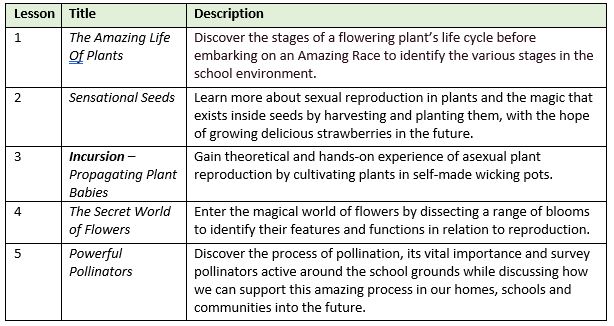 Explore the wonderful world of plant reproduction with plenty of opportunities for students to roll up their sleeves and get their hands dirty in the process. Through dissecting flowers, investigating the amazing life cycle of plants, harvesting seeds, propagating plant babies and exploring pollinators active within the school, students will uncover how plants reproduce, why this is important and what they can do to sustain these processes into the future. This hands-on unit will get young people excited, curious and passionate about all things plant reproduction.