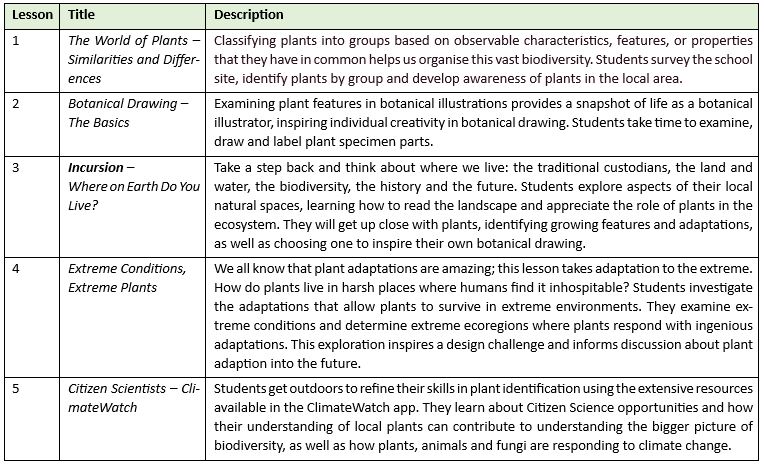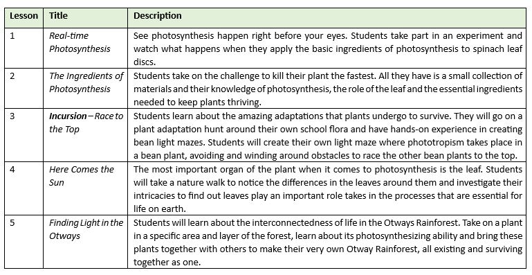 Lessons plans on the subjects of Botany Basic and the World of Photosynthesis have been designed for students in years 7–10. An overview of the units and their lessons are below.